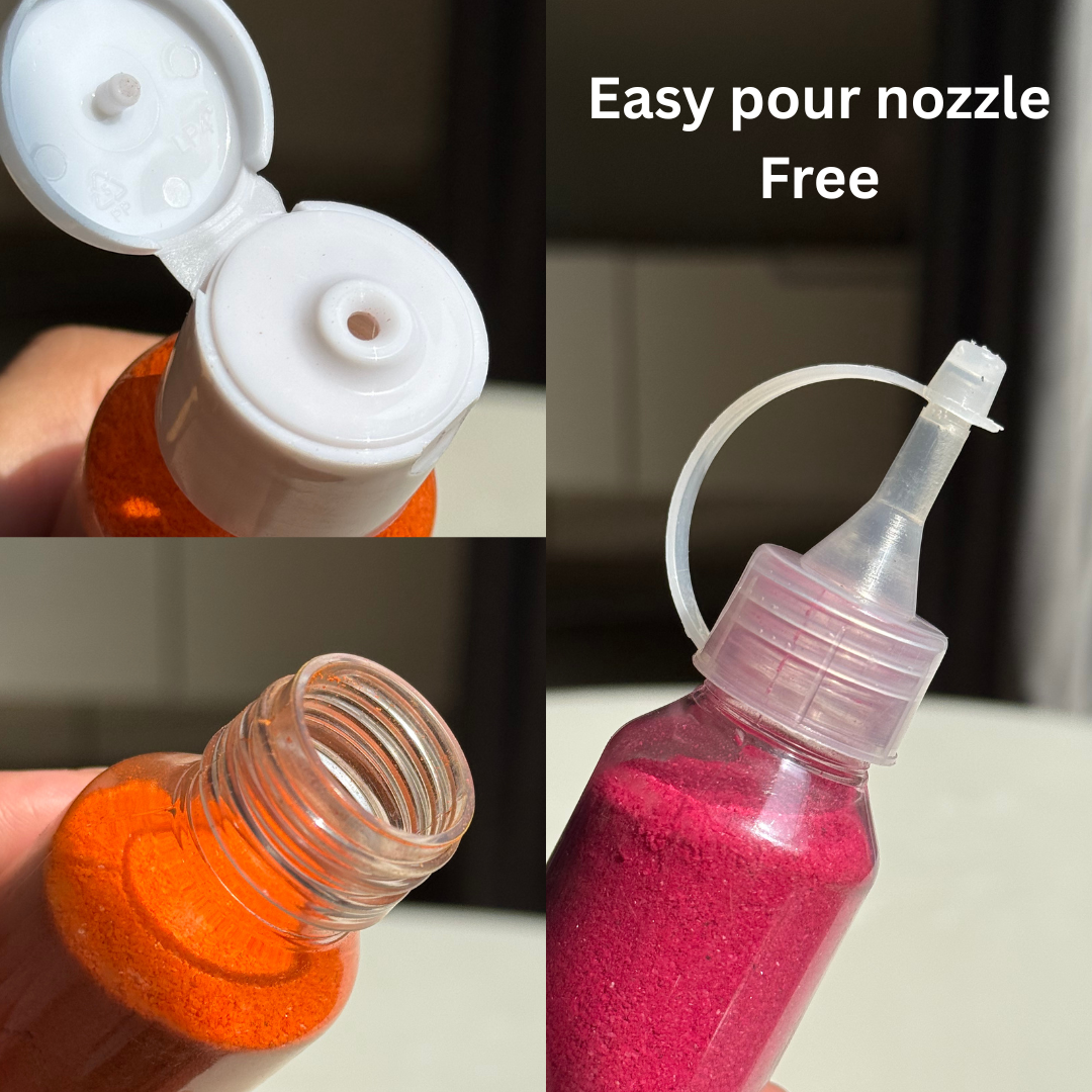 Extra nozzle included for easy pouring of your rangoli colours to help create neat, controlled designs!