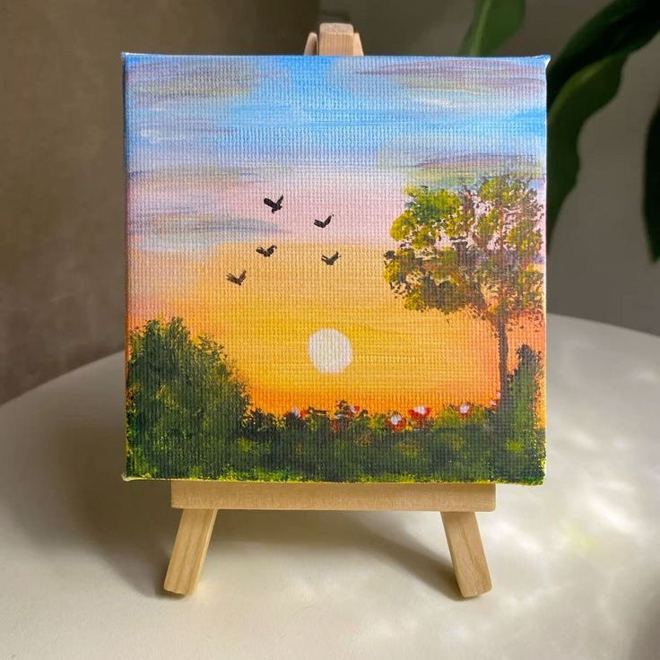 Mini Painting Kit | Mini Canvas Acrylic Painting Kit with Wood Easel, 4x4 inch Canvas, 6 Acrylic Paints, Brushes and colour mixing Palette